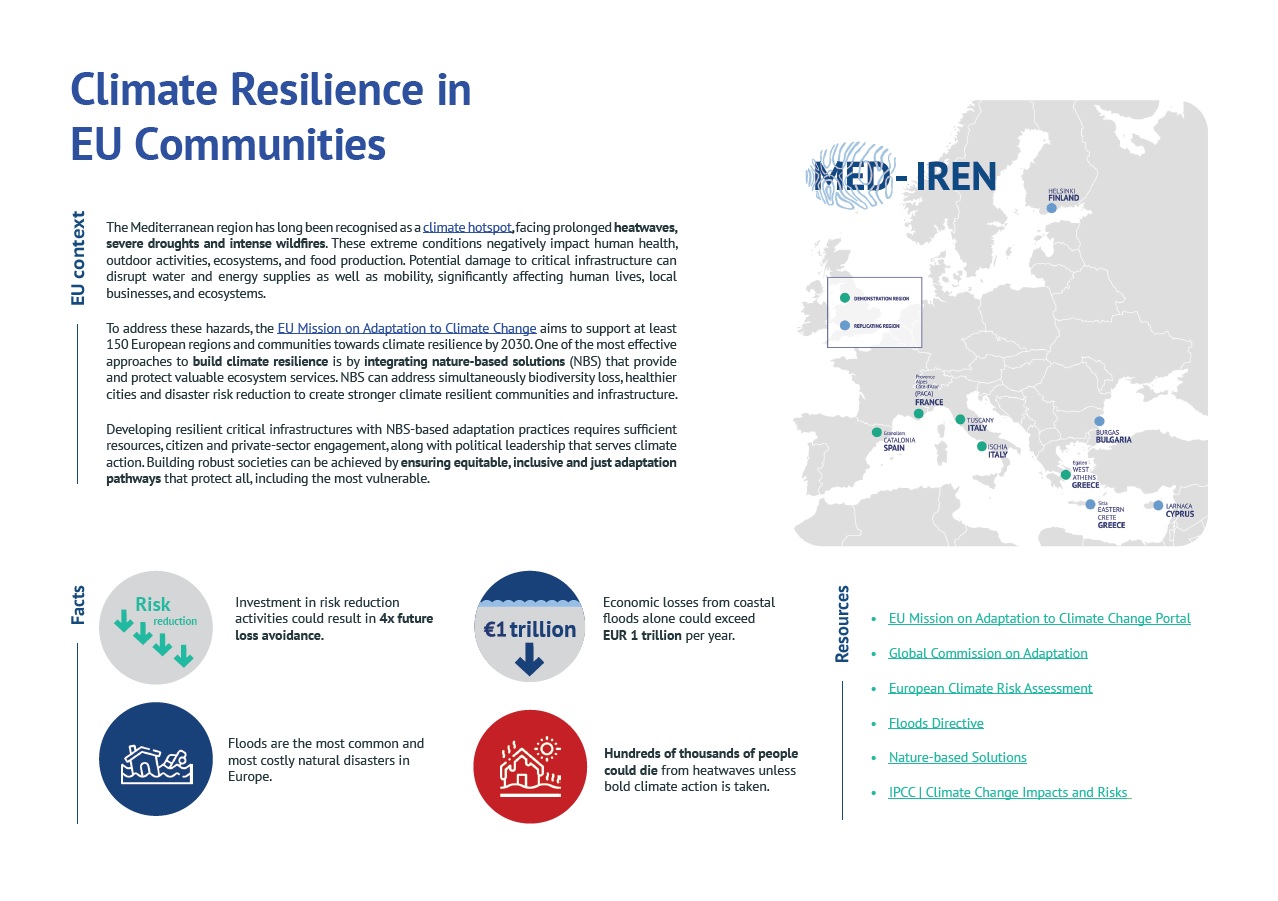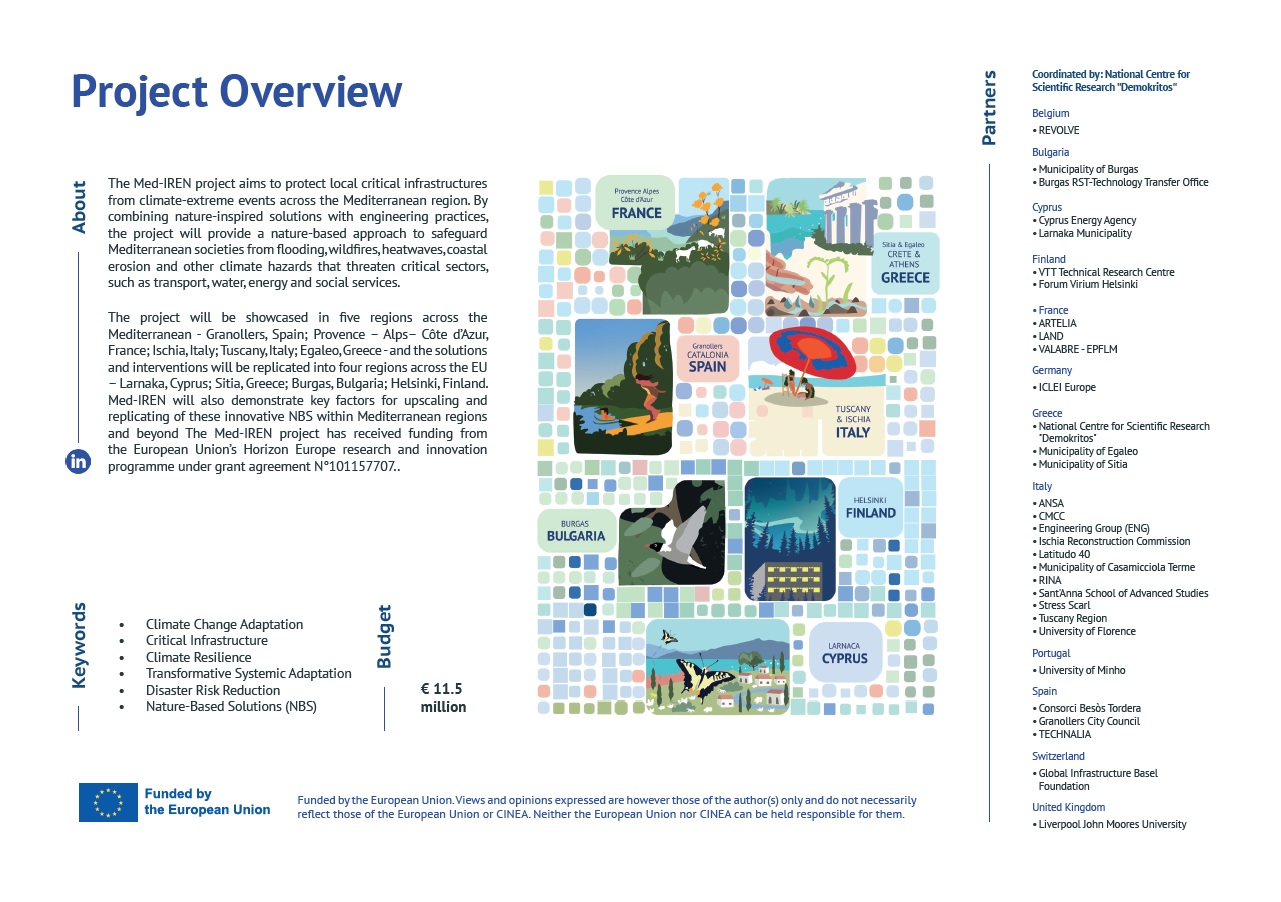 Λύσεις Βασισμένες στη Φύση (Nature-Based Solutions – NBS) για την ενίσχυση της κλιματικής ανθεκτικότητας σε καίριους τομείς, όπως η ενέργεια, οι μεταφορές, το νερό, οι ψηφιακές τεχνολογίες (ICT) και οι κοινωνικές υπηρεσίες. Το Med-IREN θα αποδείξει στην πράξη πώς οι φυσικές λύσεις μπορούν να μειώσουν τους κλιματικούς κινδύνους και να διασφαλίσουν τη βιωσιμότητα των υποδομών απέναντι στις προκλήσεις της κλιματικής αλλαγής.