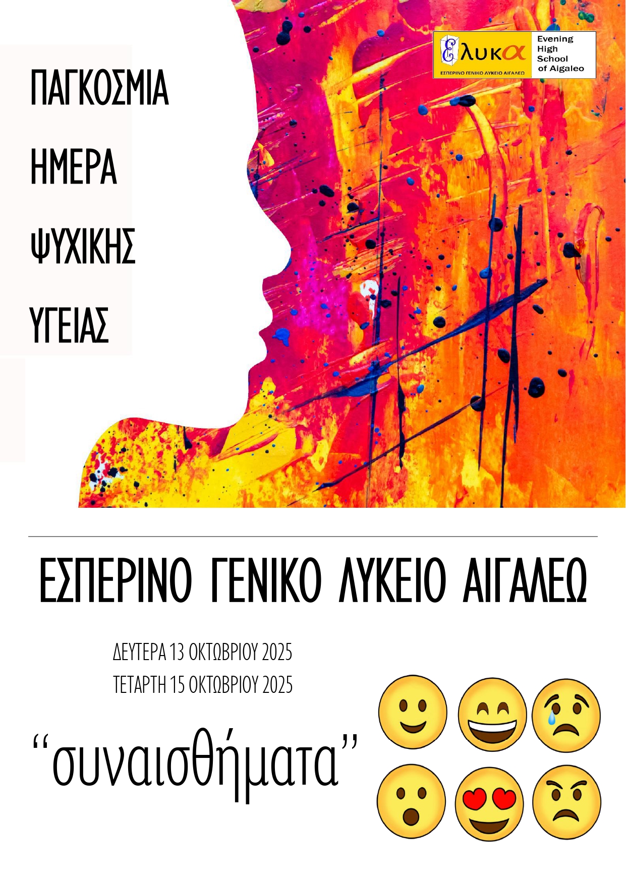 Στο πλαίσιο αυτό, στο σχολείο μας αφιερώσαμε 2 ώρες την Δευτέρα 13 Οκτωβρίου 2025 και 2 ώρες την Τετάρτη 15 Οκτωβρίου 2025 σε δράσεις προαγωγής της κοινωνικής και συναισθηματικής ευεξίας μαθητών/μαθητριών και ευαισθητοποίησης της σχολικής κοινότητας για τη σημασία της ψυχικής υγείας. Οι μαθητές/τριες μας εργάστηκαν ομαδοσυνεργατικά, συζήτησαν, διαφώνησαν, συμφώνησαν, δημιούργησαν τα προγράμματά τους και κατέγραψαν σε λεκτικές διατυπώσεις τα μηνύματά τους.