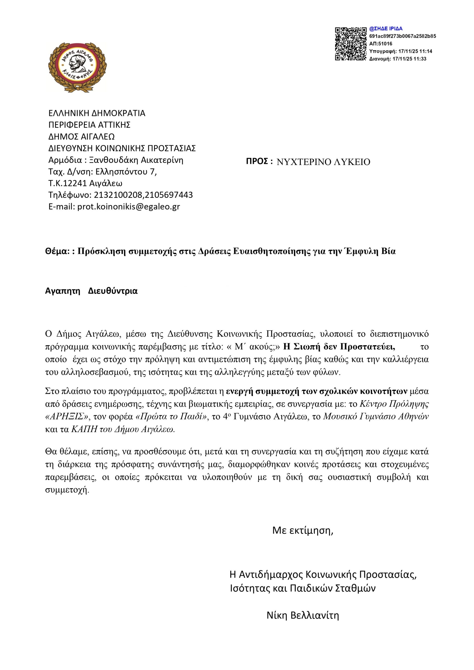 Ο Δήμος Αιγάλεω, με αφορμή την Παγκόσμια Ημέρα για την Εξάλειψη της Βίας κατά των Γυναικών, υλοποίησε μέσω της Διεύθυνσης Κοινωνικής Προστασίας, σε συνεργασία με την Επιτροπή Ισότητας και την Επιτροπή Κοινωνικής Πολιτικής και Αλληλεγγύης του Δήμου, το διεπιστημονικό πρόγραμμα κοινωνικής παρέμβασης «Με Ακούς; Η Σιωπή ως Τραύμα, ο Λόγος ως Θέση και Επιλογή», με στόχο την ευαισθητοποίηση και την ενεργοποίηση της τοπικής κοινωνίας απέναντι στο φαινόμενο της Έμφυλης Βίας.