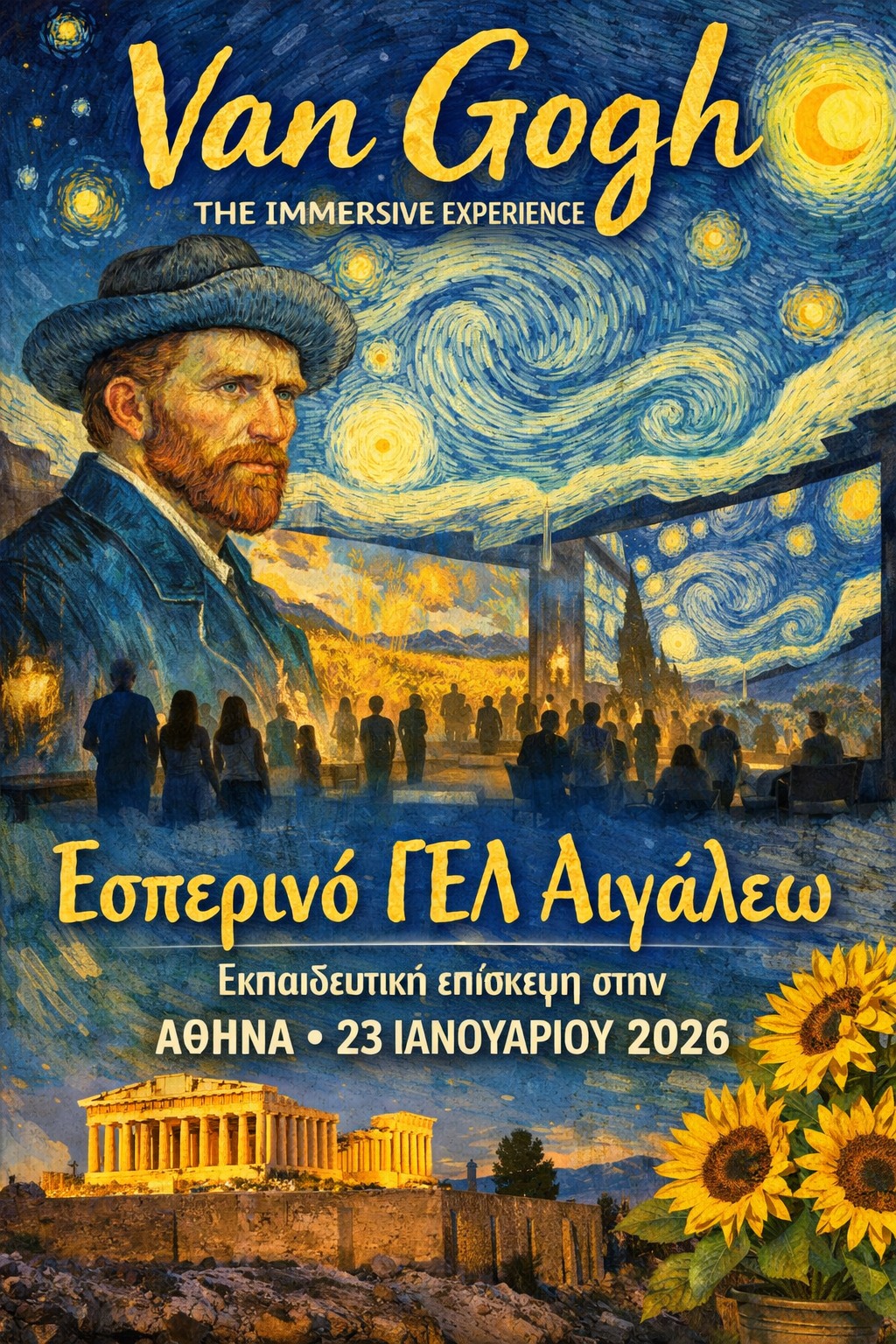 Την Παρασκευή 23-1-2026, με 22 μαθητές/τριες των τάξεων Α, Β και Γ, επισκεφτήκαμε το Ολυμπιακό Κέντρο Γουδί για την ξενάγηση στη ψηφιακή έκθεση Van Gogh – The Immersive Experience με στόχο την επαφή τους με την τέχνη μέσω σύγχρονων ψηφιακών μέσων και την ενίσχυση της πολιτισμικής τους καλλιέργειας.