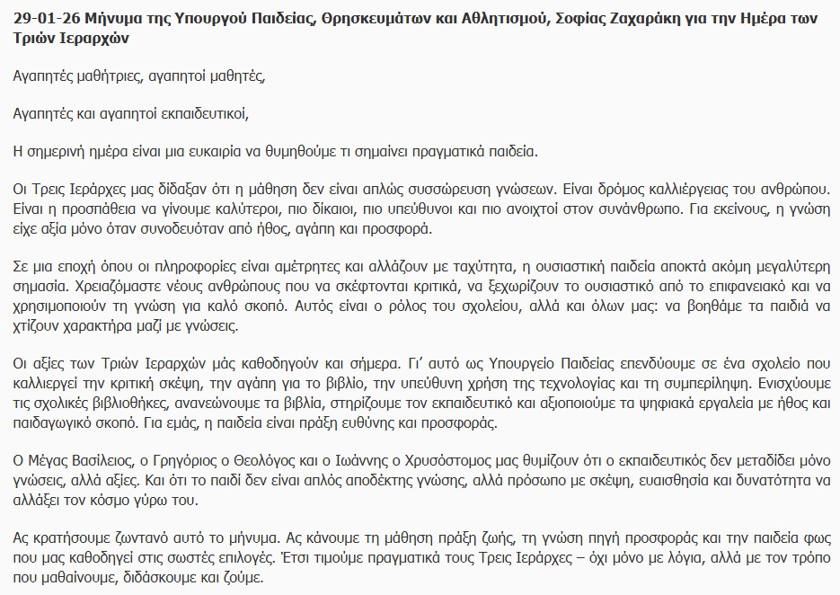 Την Παρασκευή 30 Ιανουαρίου 2026, έγινε ο εορτασμός για την προσφορά των Τριών Ιεραρχών στα Γράμματα.